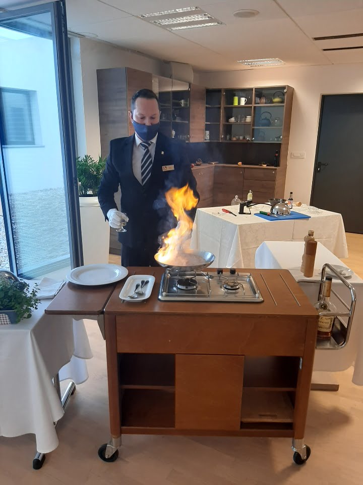 Odlično online vajo pri predmetu Osnove strežbe je izvedel Andrej Kurež. Študenti so tako lahko spoznali osnove flambiranja.